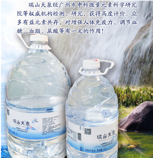瑞山天泉真有这么好?一份由广州市中科微量元素科学研究院出具的《瑞山天泉评价报告》(上图)称:依据中国权威检测机构——中国广州分析测试中心对瑞山天泉的检测结果,该水源水的铬、锂、锶、钒、铜、钡等元素较丰富,这些元素(组合)对提高免疫力和调节血糖有一定的作用。